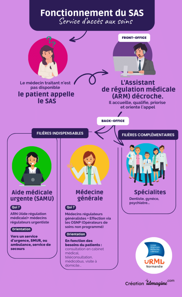 Le SAS, Service d’Accès aux Soins, est fondé en partenariat étroit et équilibré entre les médecins de ville et les professionnels de l’urgence hospitalière des SAMU. Il s’agit d’une régulation téléphonique médicale accessible à tous sur tous les territoires, quel que soit le lieu d’appel. Il a pour objectif d’organiser une réponse territoriale adaptée à un patient nécessitant un soin urgent, ou à un patient ayant besoin d’un soin non programmé sous 48h, et qui n’a pas de médecin traitant ou dont le médecin traitant n’est pas disponible. Il participe ainsi à la lutte contre les inégalités sociales et territoriales de santé.